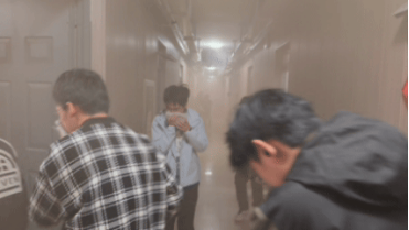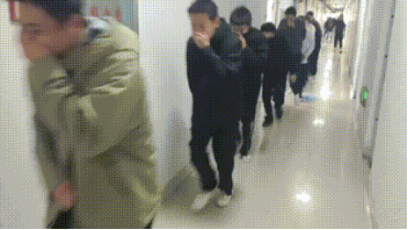 在保卫人员、公寓管理人员和学生干部的引导下,楼内学生采取压低身姿、捂住口鼻的正确姿势,快速、有序地通过安全通道撤离,在室外安全区域集合。
